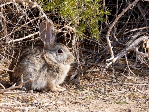 This was typical behavior, considering my presence. “Sometimes they will freeze when danger lurks and scrunch down to blend into their surroundings,” states the Nevada Department of Wildlife website, “or they slowly try to sneak away to safety.” Which is exactly what this cottontail did: it took off into the brush after less than a minute. I know when I’m not wanted!