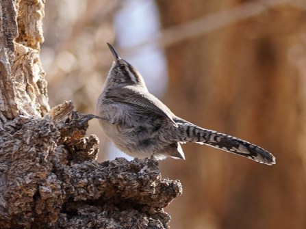 Speaking of tiny bugs, I happened upon a Bewick’s wren (see photo) near the spot with the suspected insect eggs. It was bouncing around on a decomposing tree scouting for insects, and I was lucky to get a shot of it. It was a pretty scrawny thing that moved quickly and blended perfectly with the color of bark. I initially thought it was a cactus wren but realized the delineations after consulting my trusty field guides.