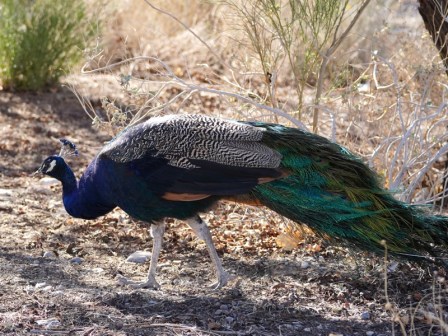 Before I left the park, ,I was surprised to see the two male peacocks lounging and roaming on a patch of grass near one of the parking lots. I had already put away my camera, but of course, I scooted back to my car to get it.